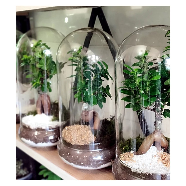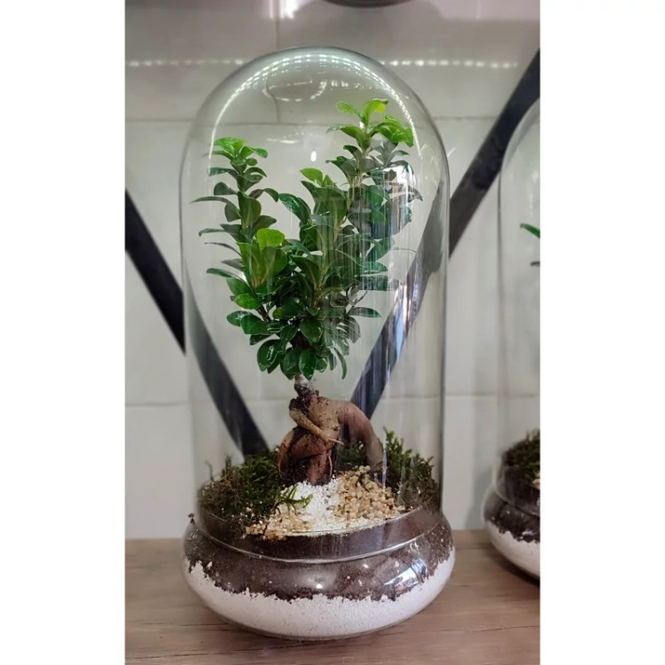 بونسای جنسینگ پیوندی فیکوس میکرو کارپا داخل شیشه مدل پلکسی نگهداری: بدلیل بسته بودن محیط و رطوبت بالا نیاز به آبیاری کمی دارد،آبیاری فقط بصورت اسپری روی سطح خاک به اندازه ای که خاک مرطوب شود.مراقب باشید به اندازه ای آبیاری نکنید که انتهای شیشه آب جمع شود. حدودا هفته ای یکبار تا ده روز یکبار بسته به دمای محیط آبیاری متفاوت است. روزانه حدودا یکی دو ساعت شیشه رویی را بردارید تا تهویه گیاه انجام شود. برای کود دادن از کود مایع که بصورت اسپری است استفاده کنید. نور بصورت غیر مستقیم یا از پشت پنجره و یا بصورت نور مصنوعی مانند لامپ باشد.